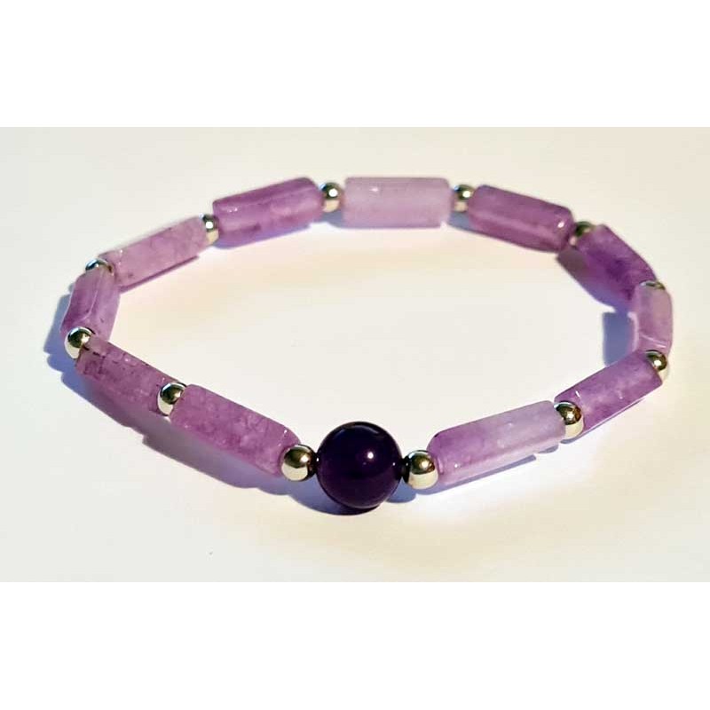 Vackert armband med avlånga ametister, silvriga kulor (dock ej silver) och större kula i ametist.Med mjukt gummiband, lätt att ta på och av.