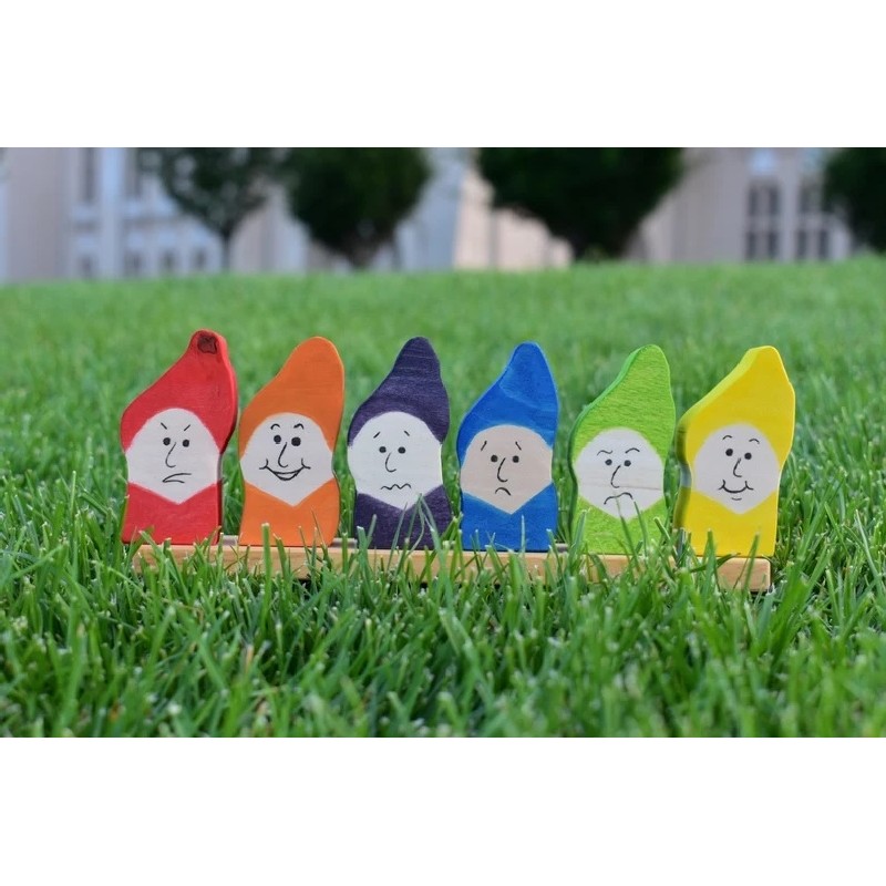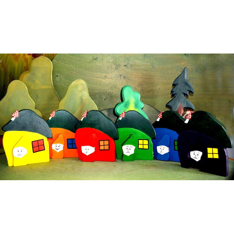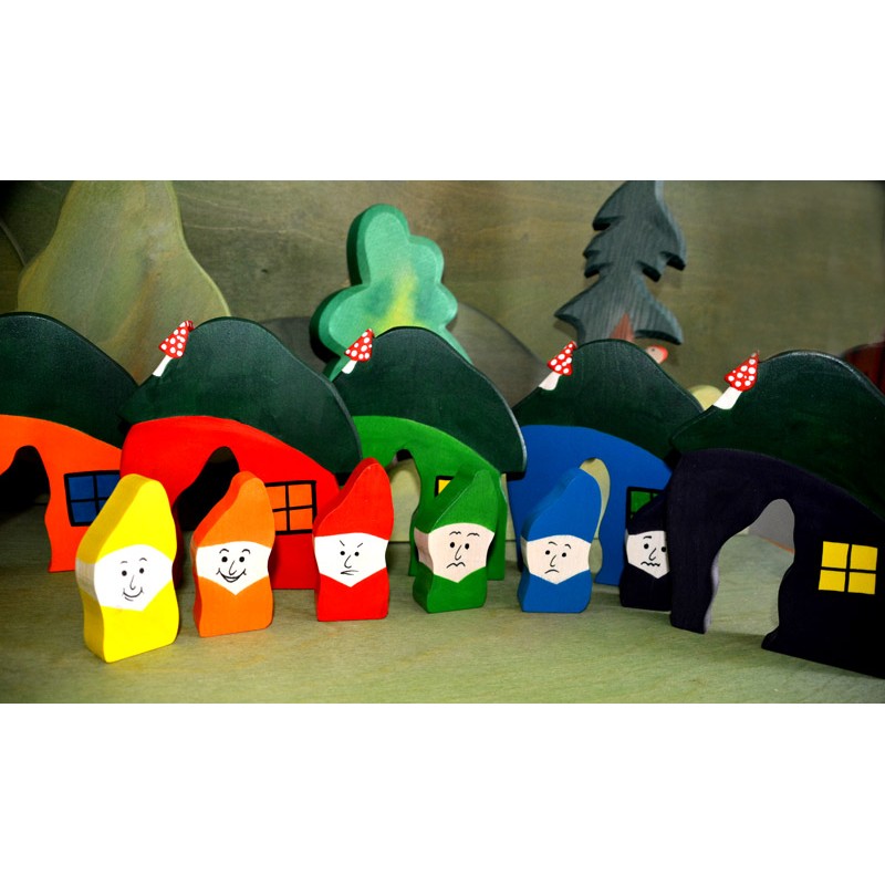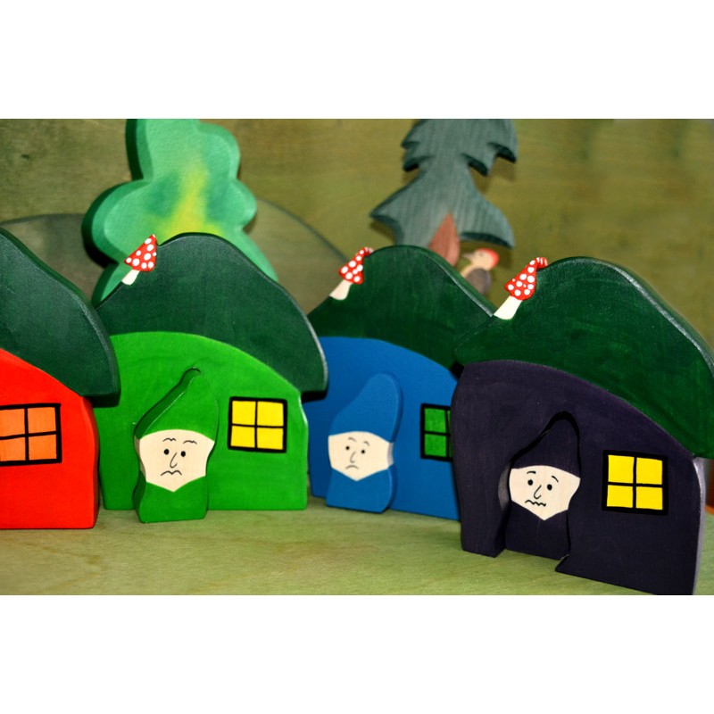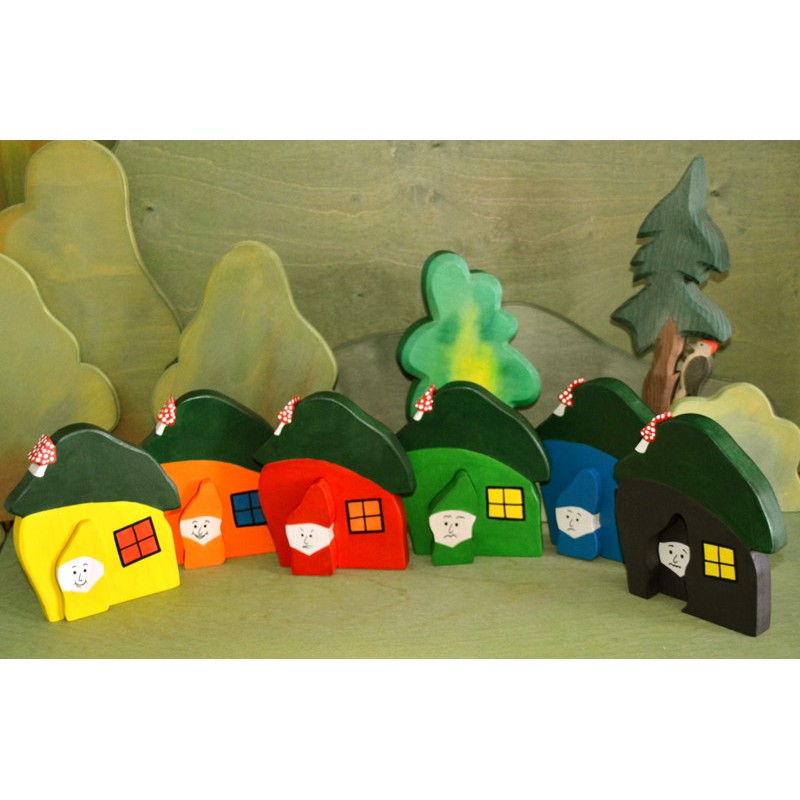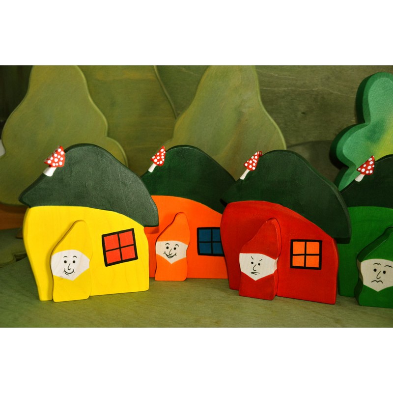 Gnom-byn består av 6 st hus och 6 st gnomer - var och en passar bara i sitt egna hus.