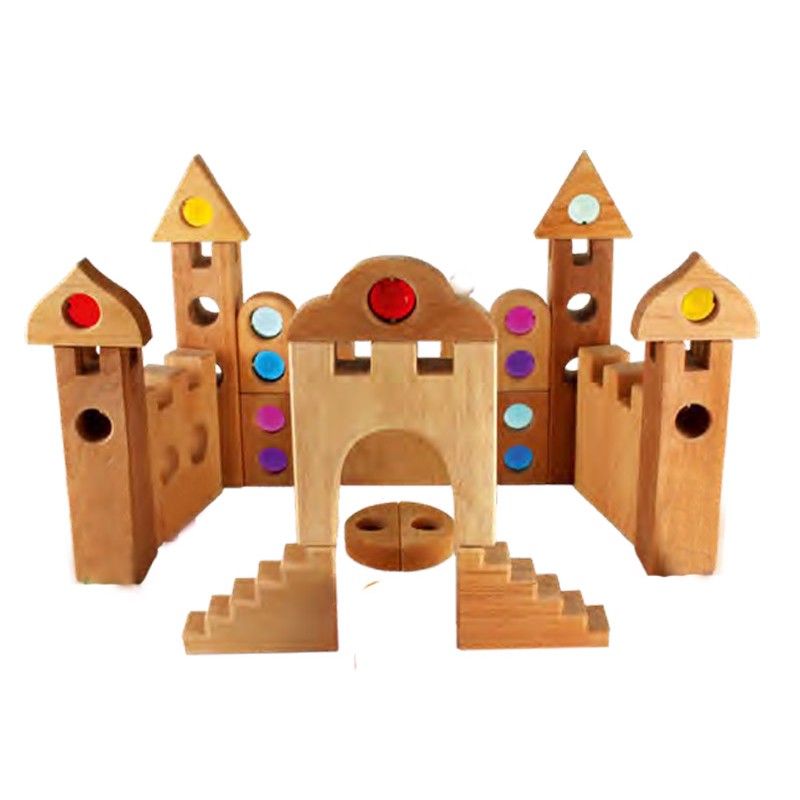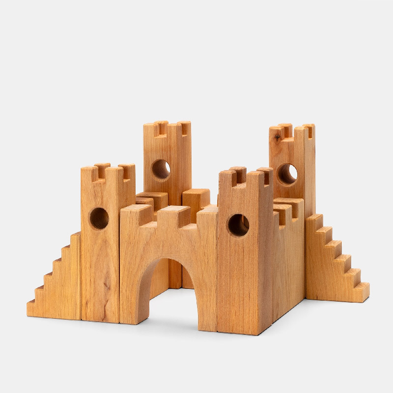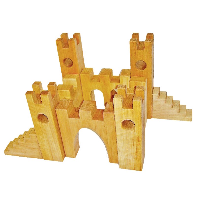 Med dessa tio klossar kan barnen bygga och byta utseende på riddarborgen.