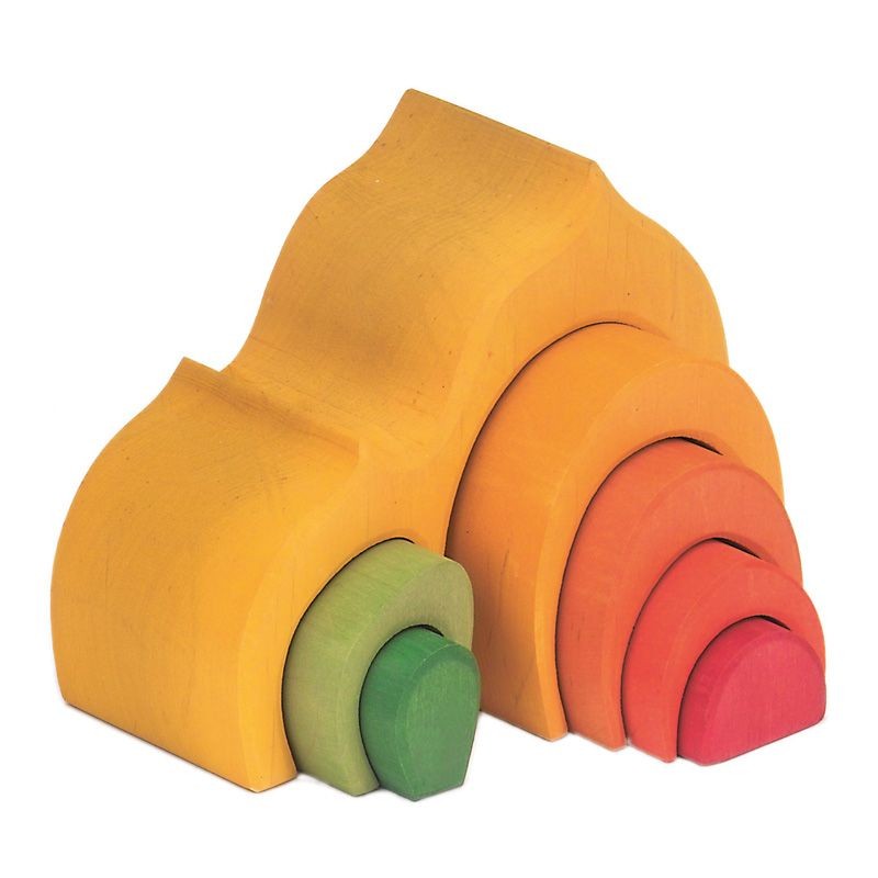 Gul liten stuga, träklossar med lök-kupoler, 8 delar som kan byggas till flera småstugor. Ca 17 cm lång, 13 cm hög