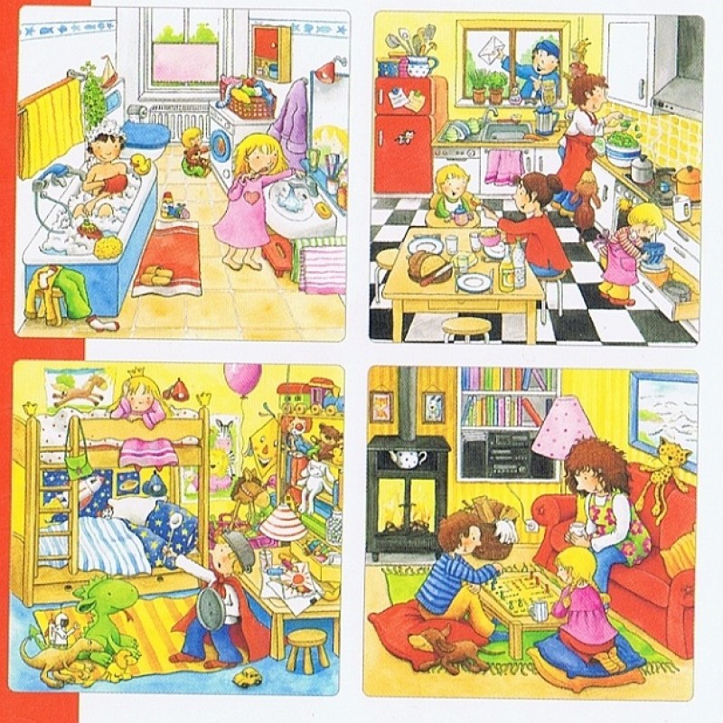 Ett trevligt pussel i träram med 4 olika lager om vad som händer under dagen i olika delar av hemmet - här finns mycket att titta på som barnen känner igen och genom att prata om bilderna kan de utveckla språket
