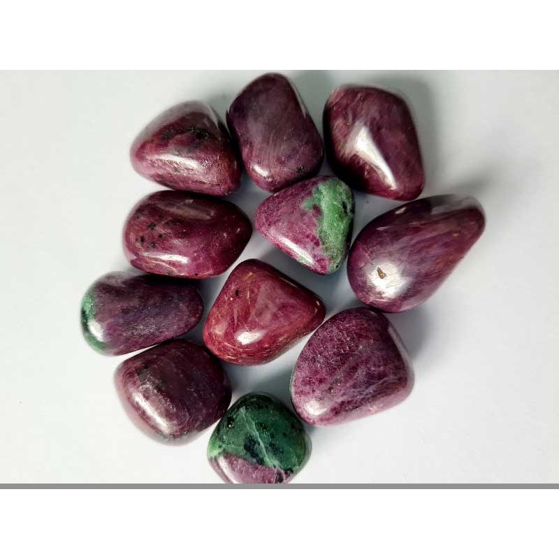 Trumlad rubin med zoisit (rubin röd, zoisit grön) ca 3 cm - 150 kr per sten för de största