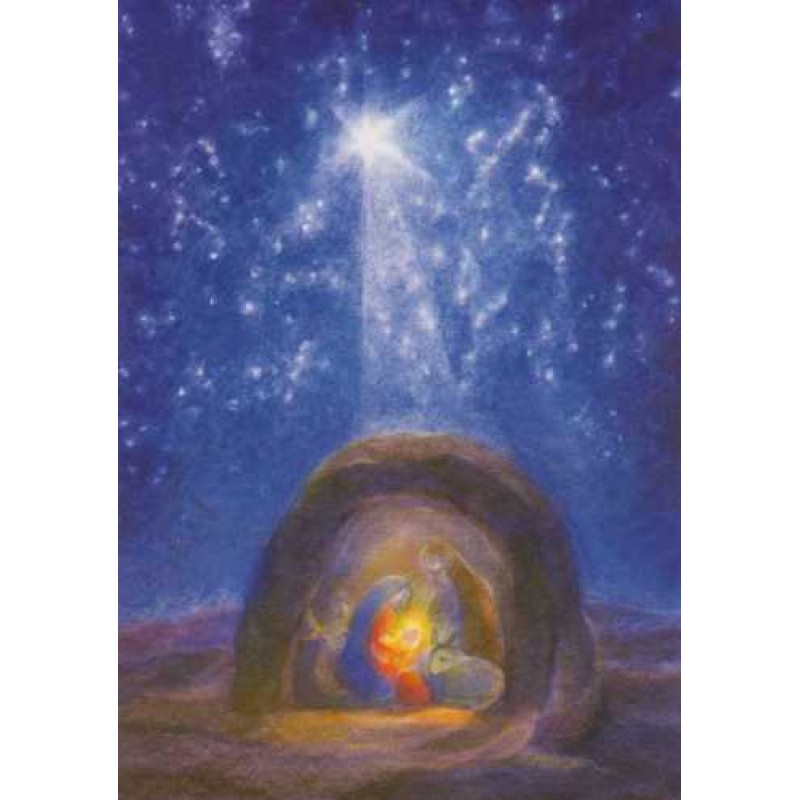 Bild Vinteljus - Heliga Familjen i grotta med djuren, stjärna lyser över dem